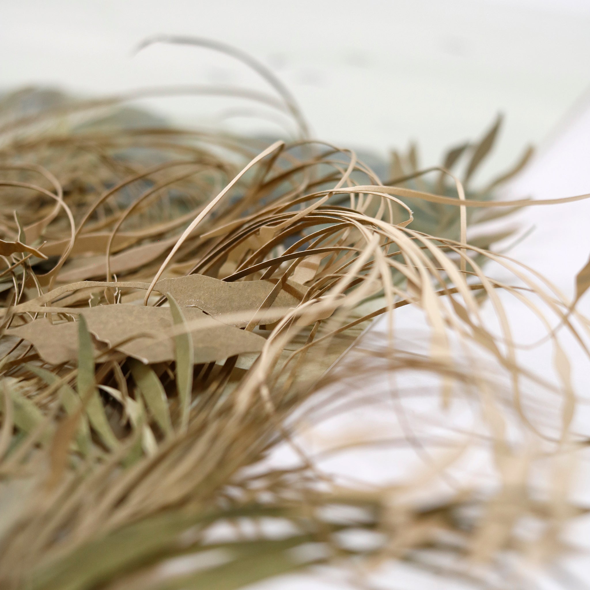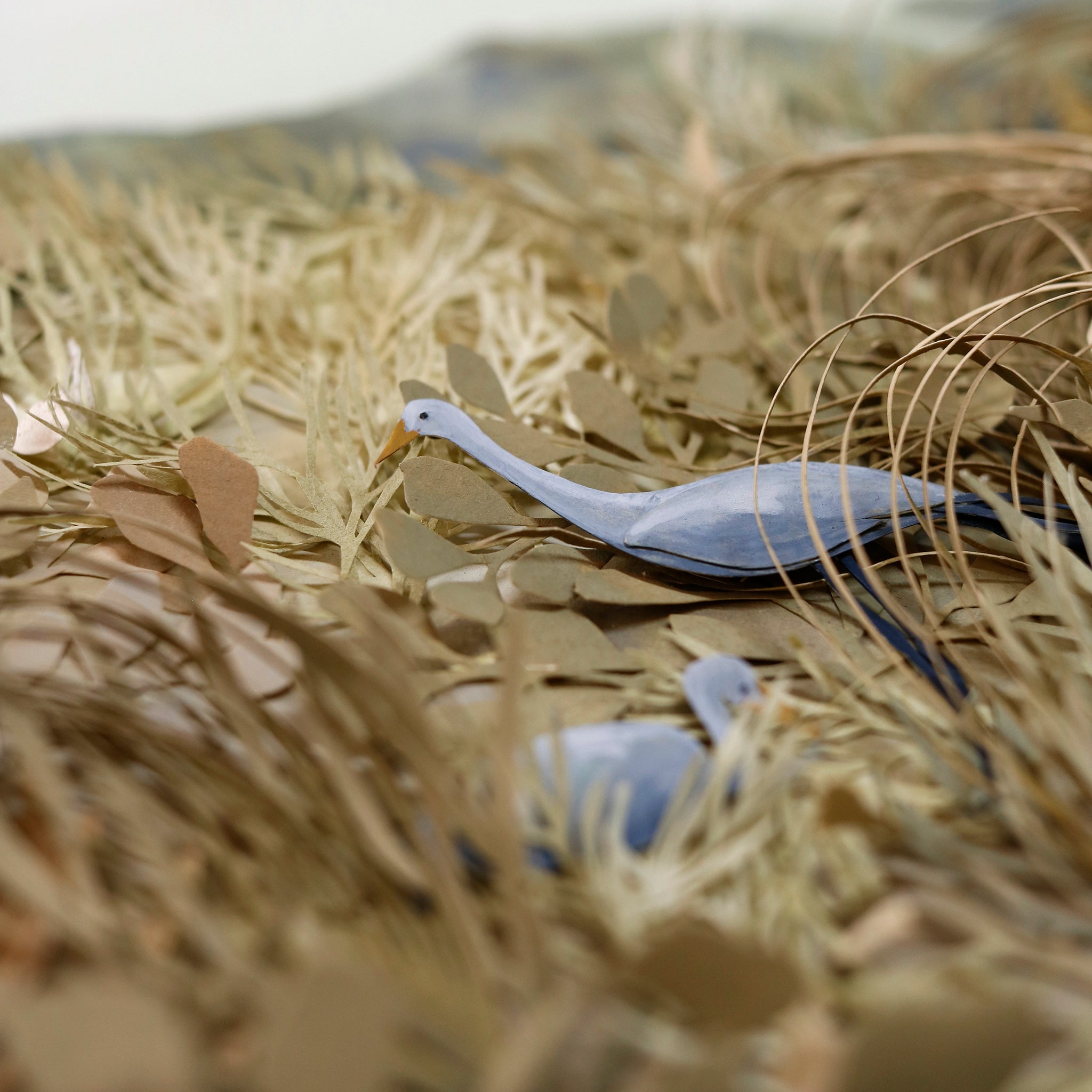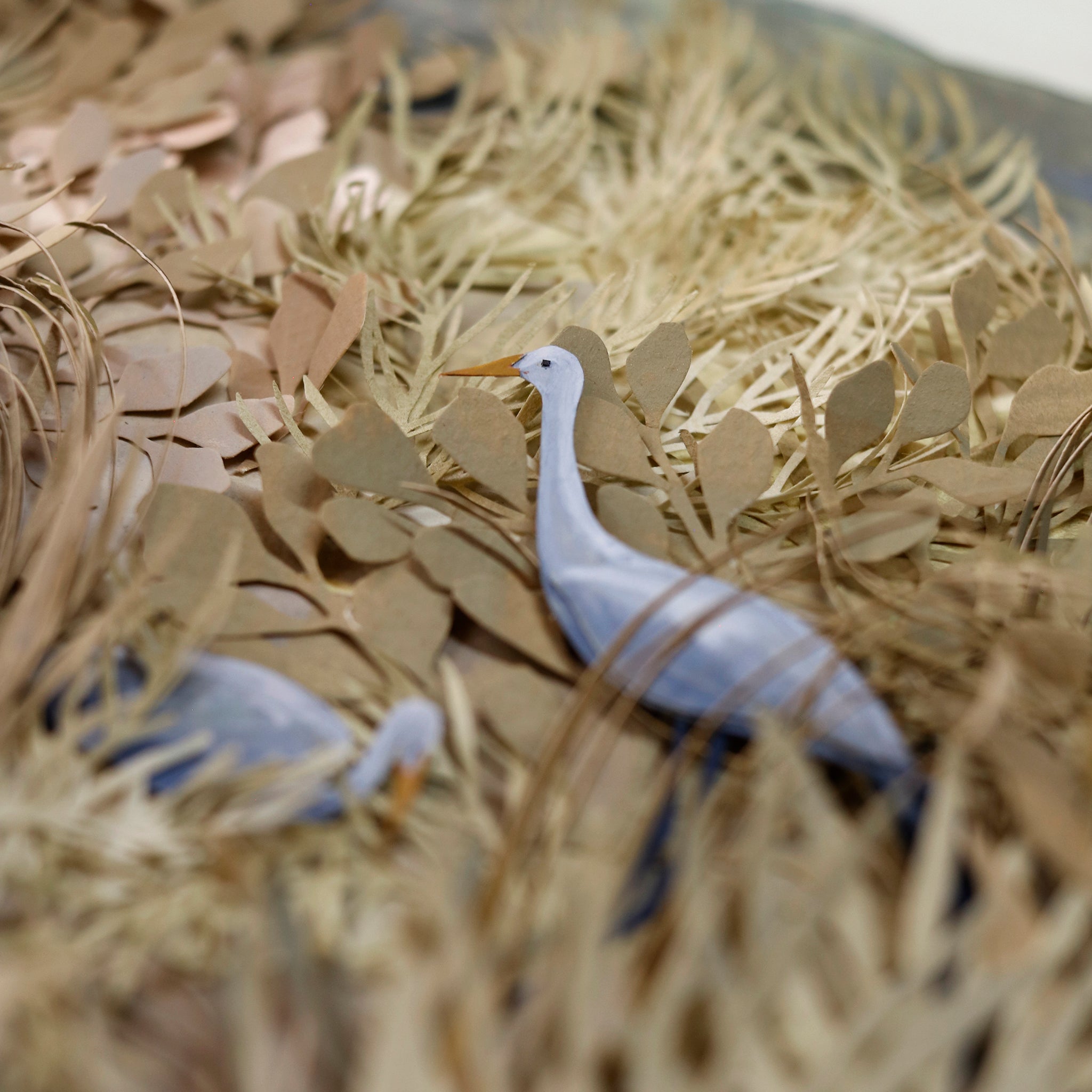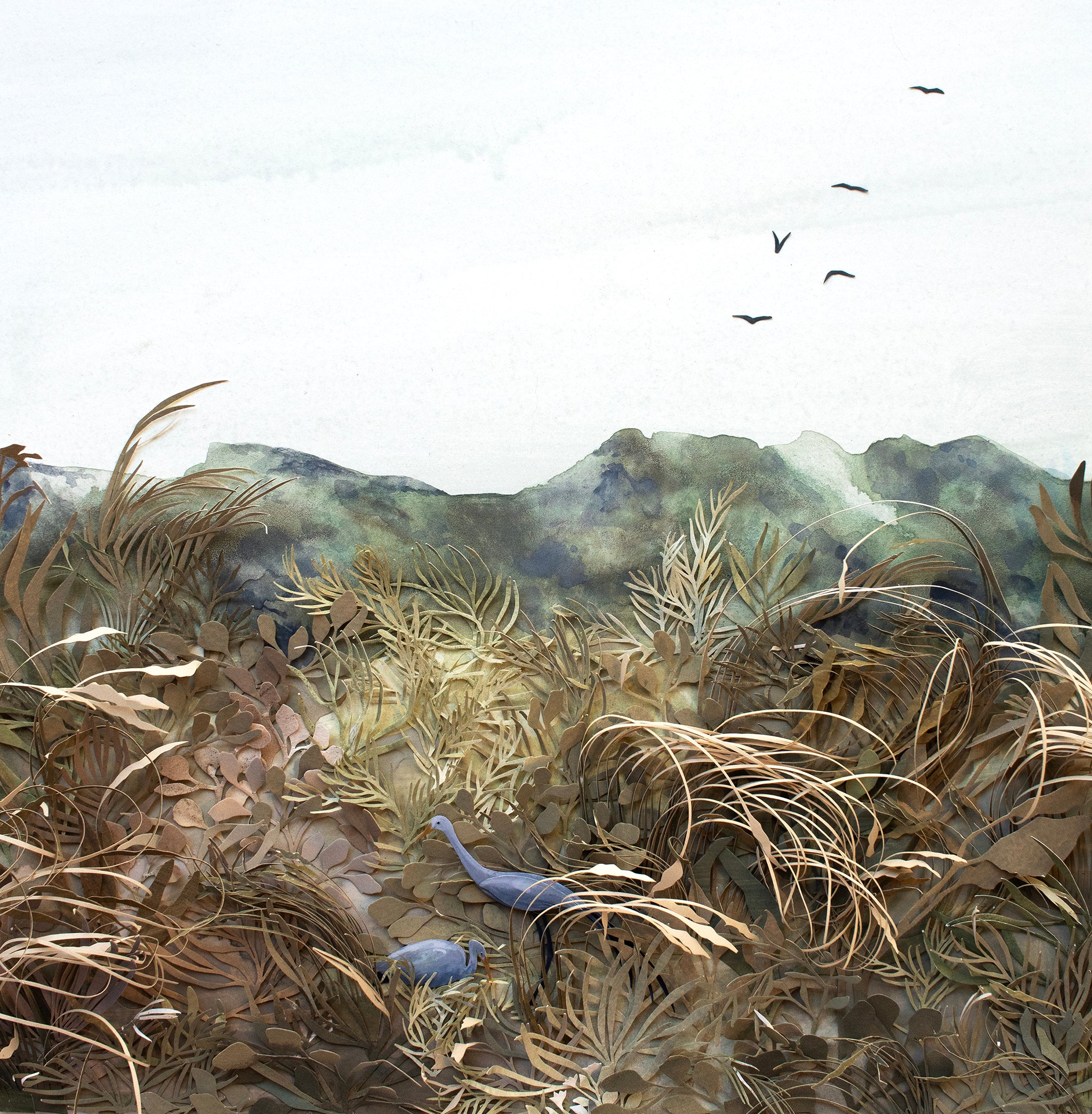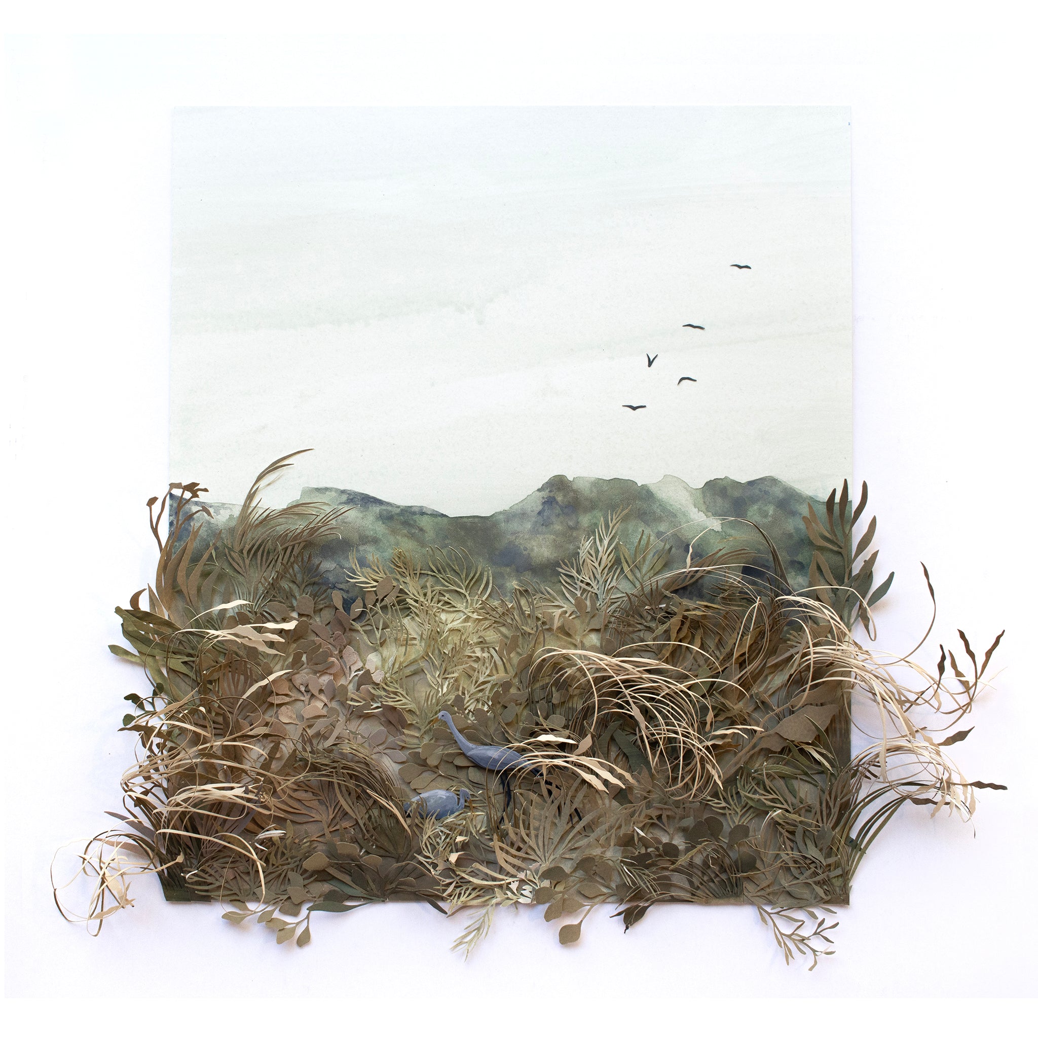 Hand-cut collage of gouache and acrylic-painted papers on 300gsm Fabriano Artistico, layered to create a dimensional collage, and adhered using archival glue.