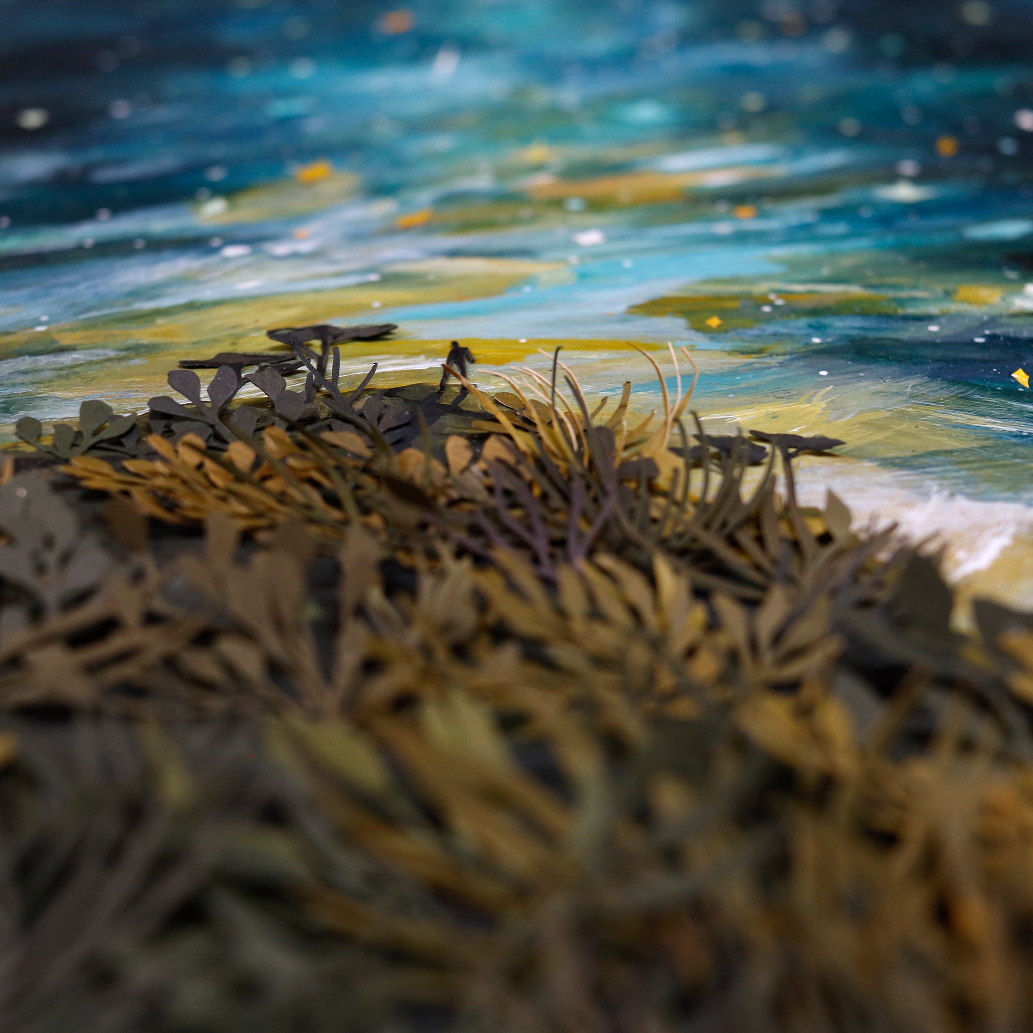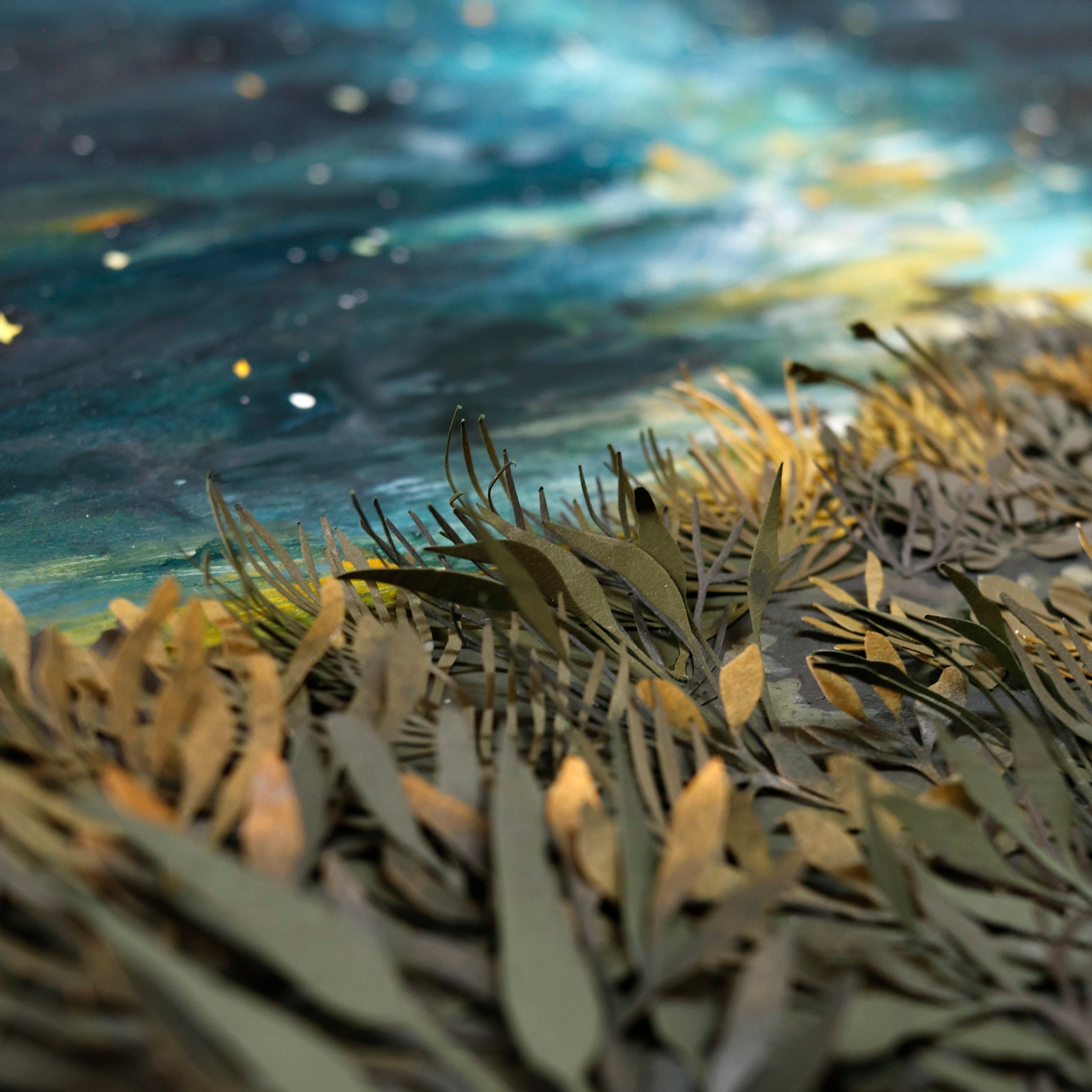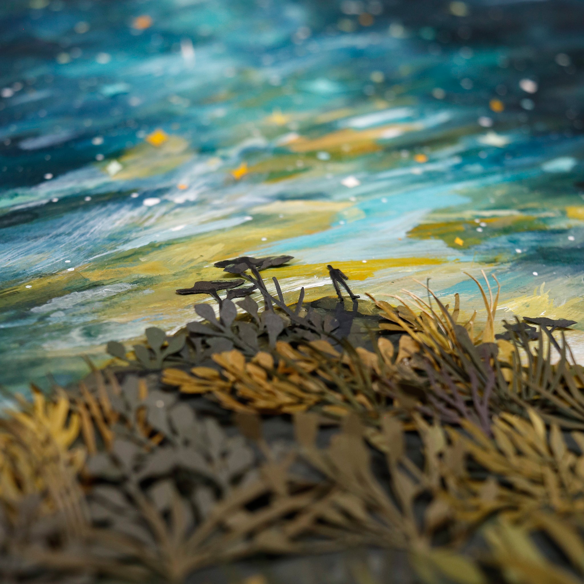 Hand-cut collage of gouache and acrylic-painted papers on 640gsm Fabriano Artistico, layered to create a dimensional collage, and adhered using archival glue.