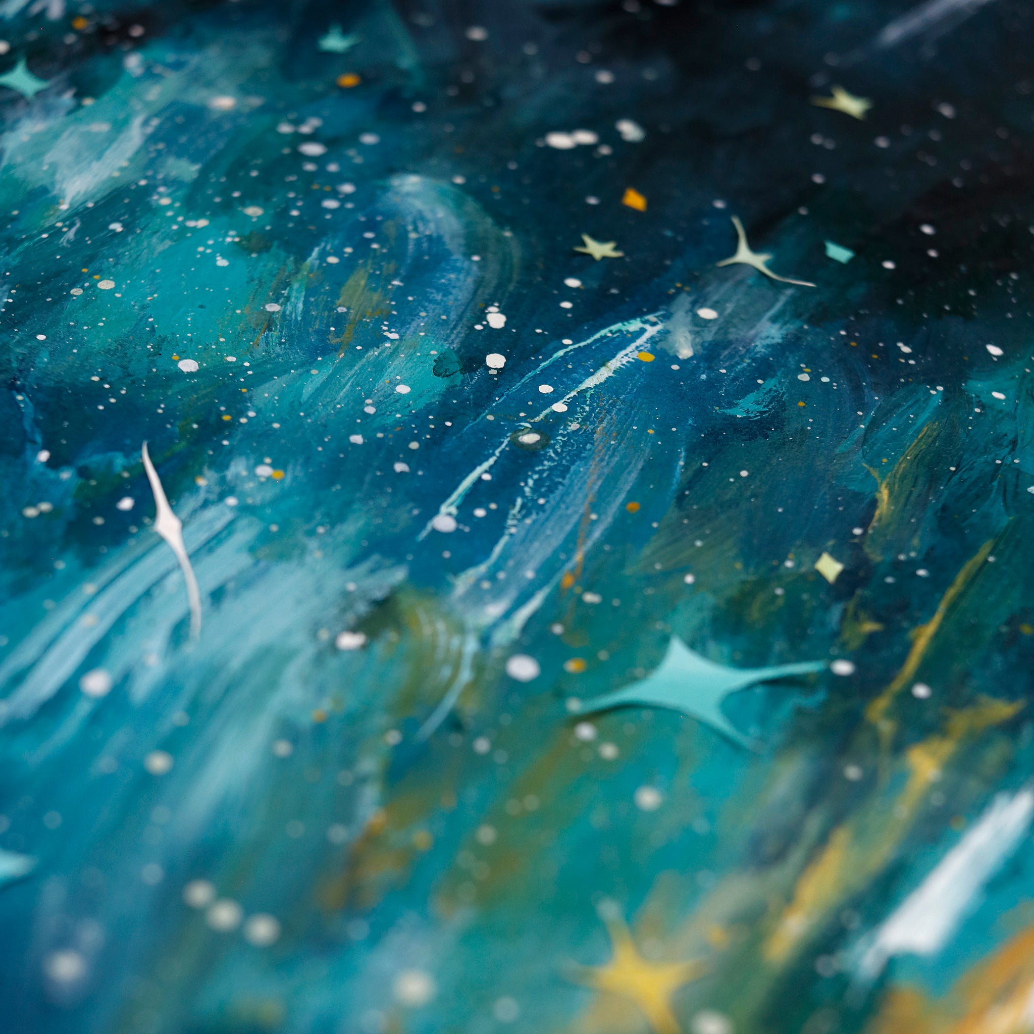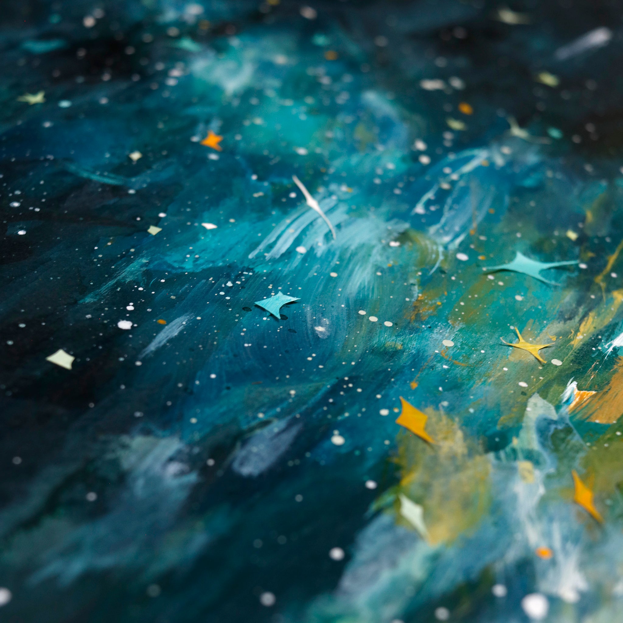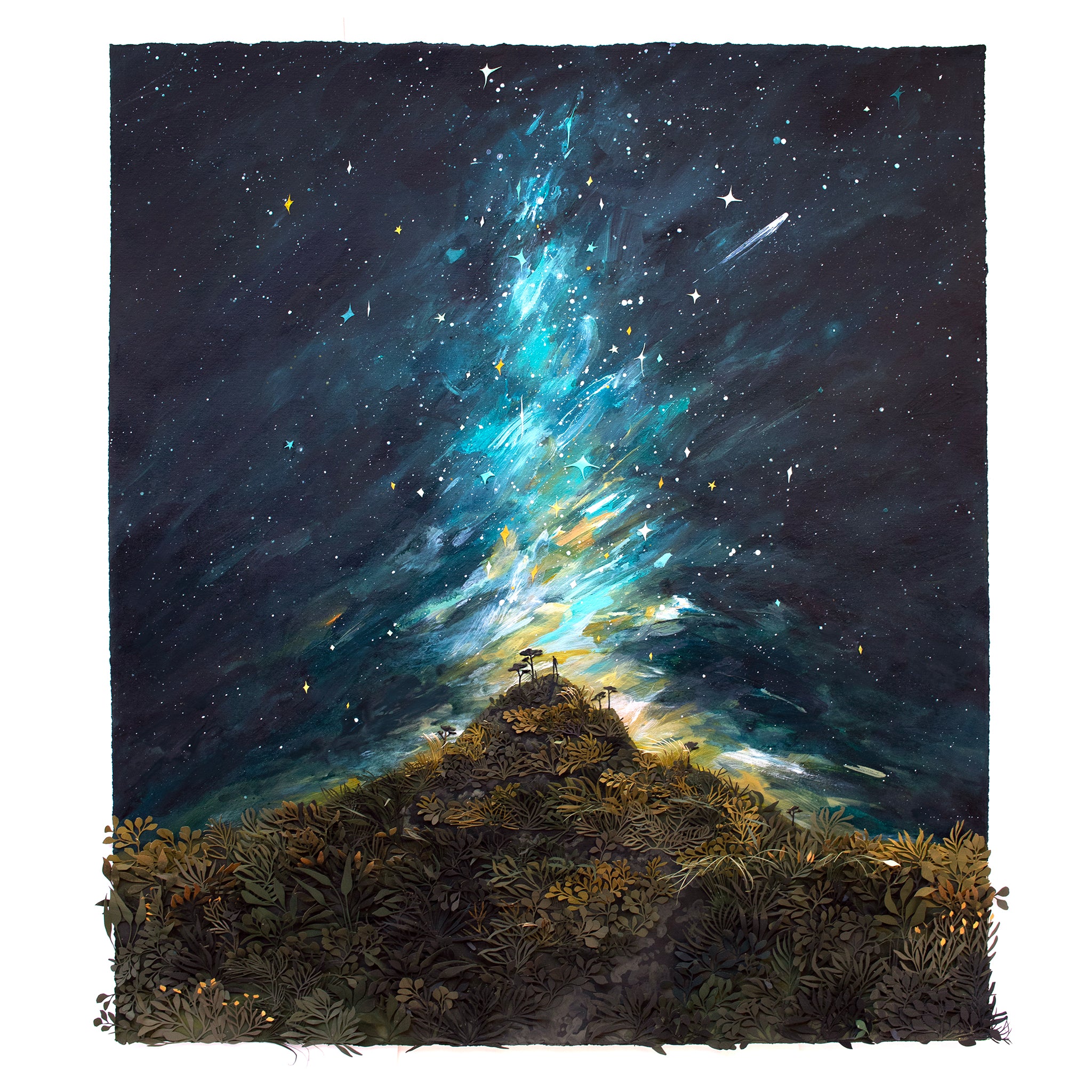 Hand-cut collage of gouache and acrylic-painted papers on 640gsm Fabriano Artistico, layered to create a dimensional collage, and adhered using archival glue.