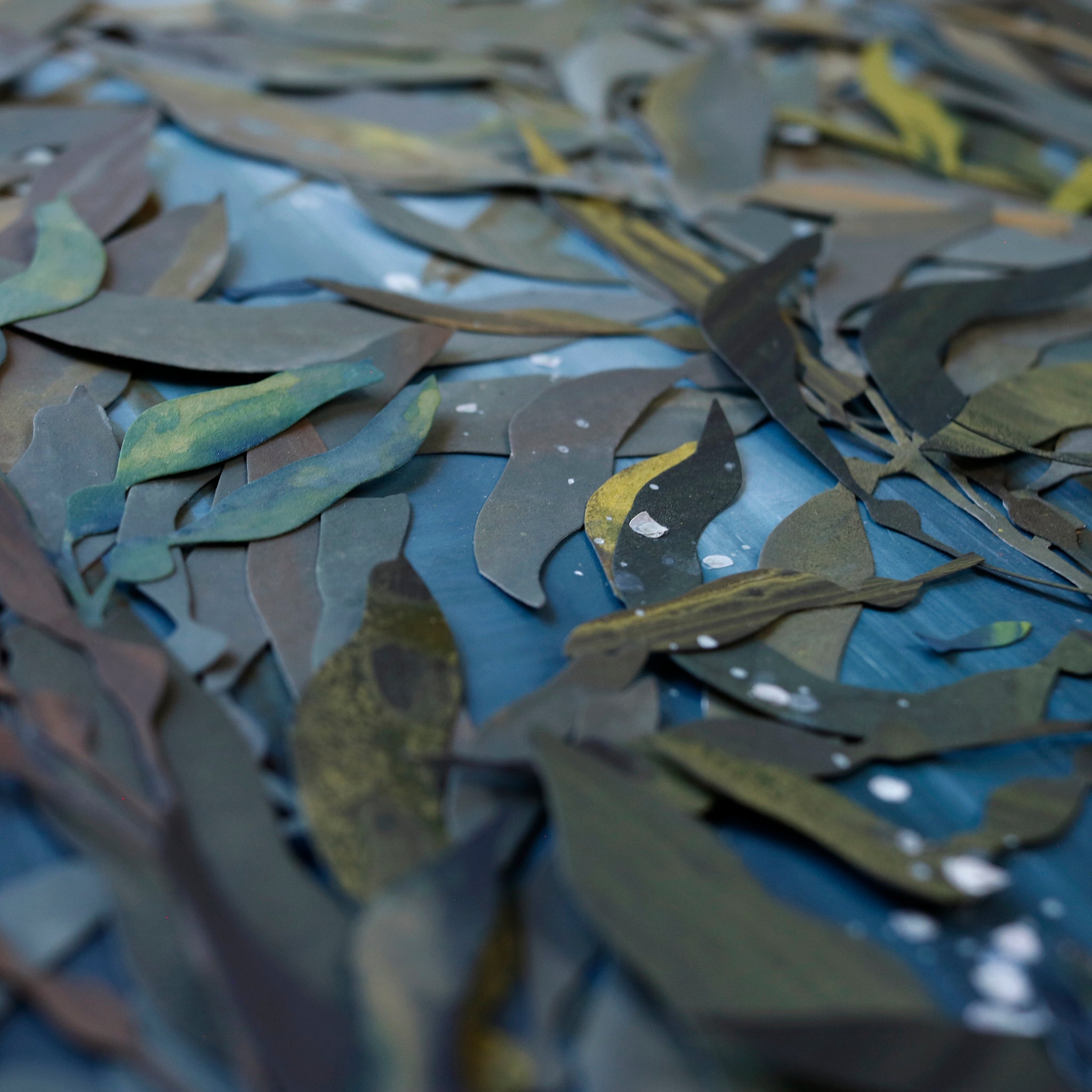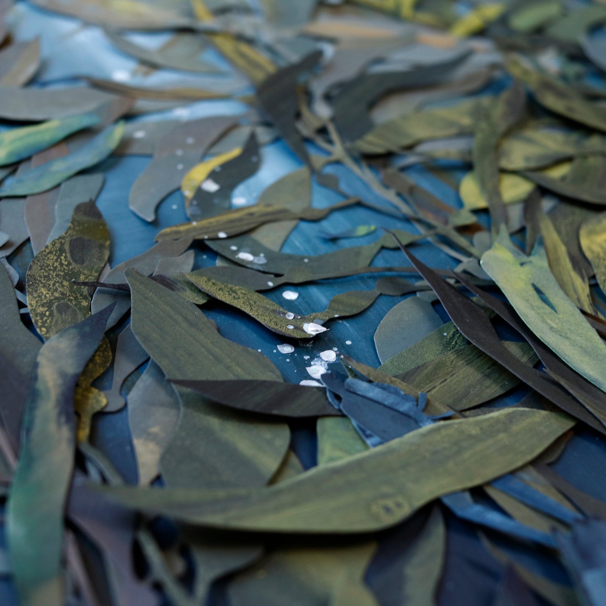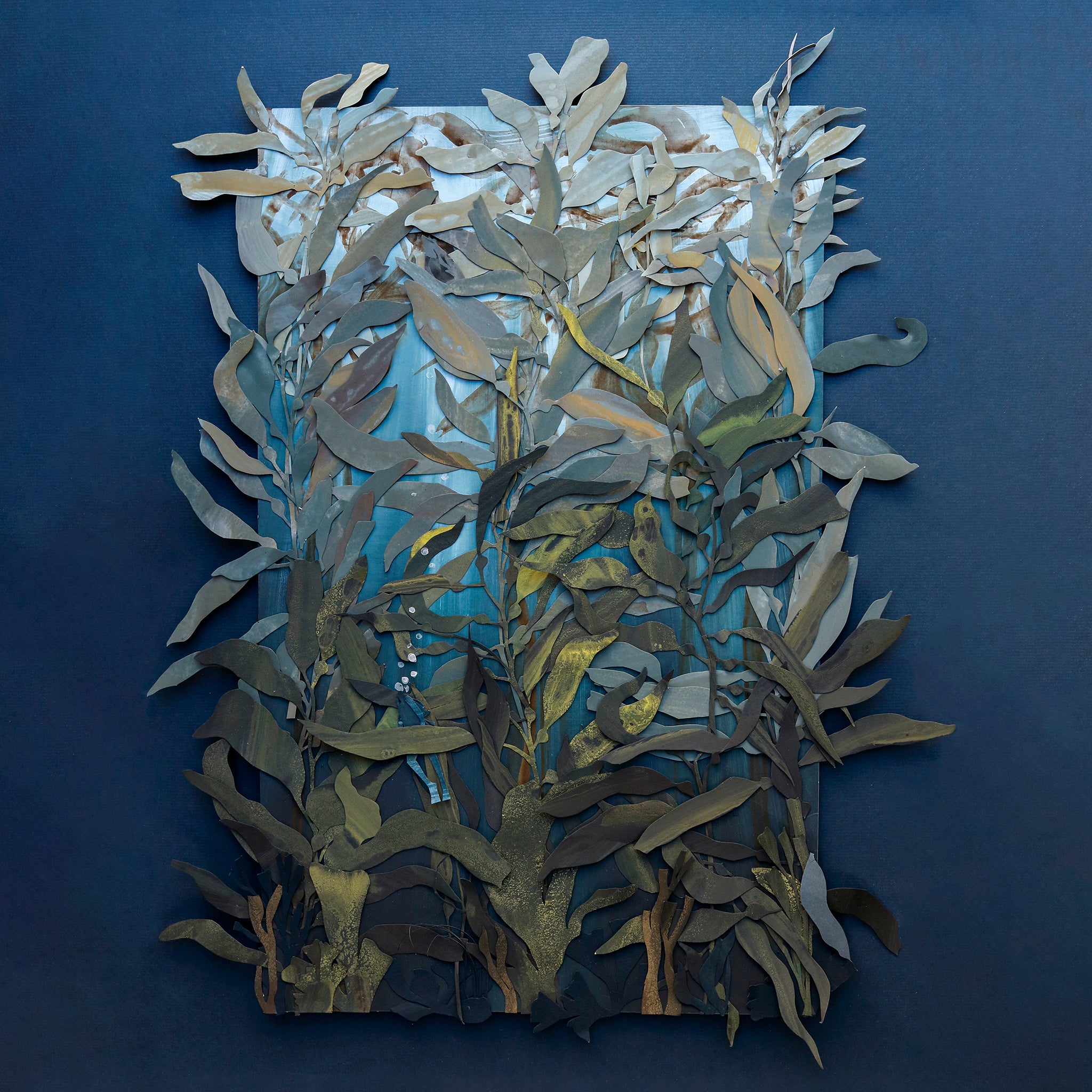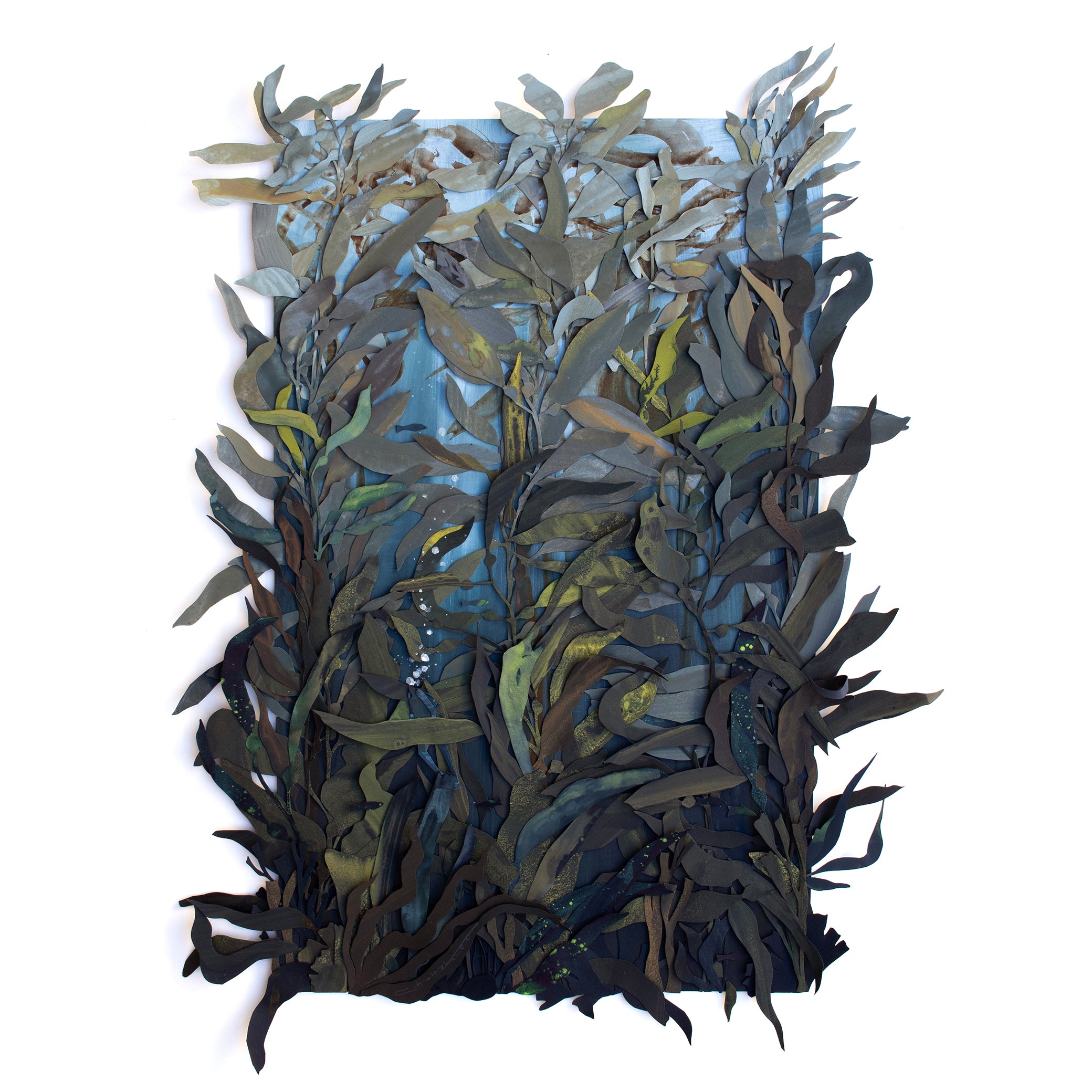 Hand-cut collage of gouache and acrylic-painted papers on 300gsm Fabriano Artistico, layered to create a dimensional collage, and adhered using archival glue.