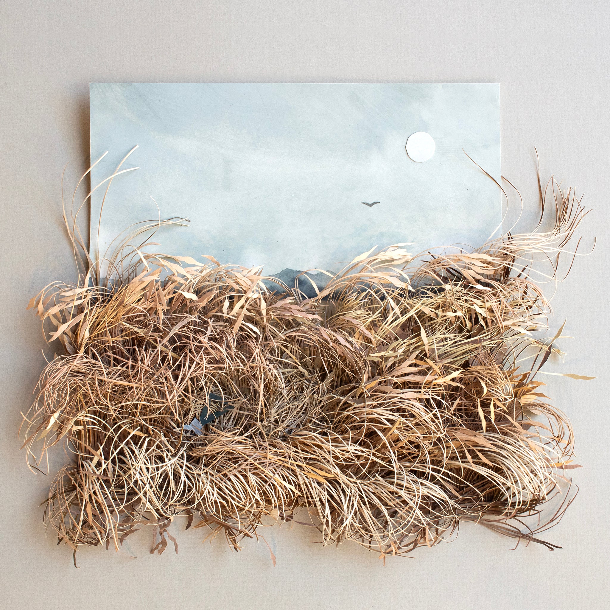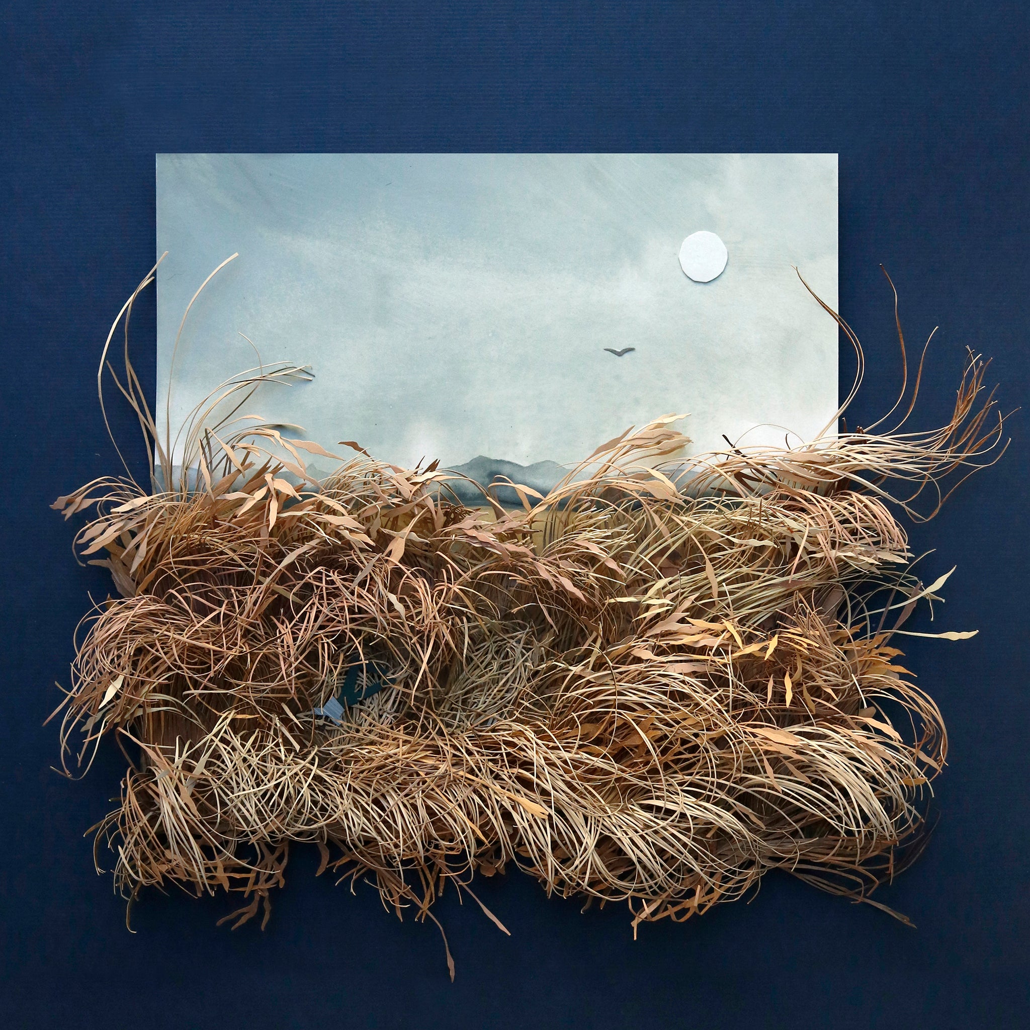 Hand-cut collage of gouache and acrylic-painted papers on 300gsm Fabriano Artistico, layered to create a dimensional collage, and adhered using archival glue.